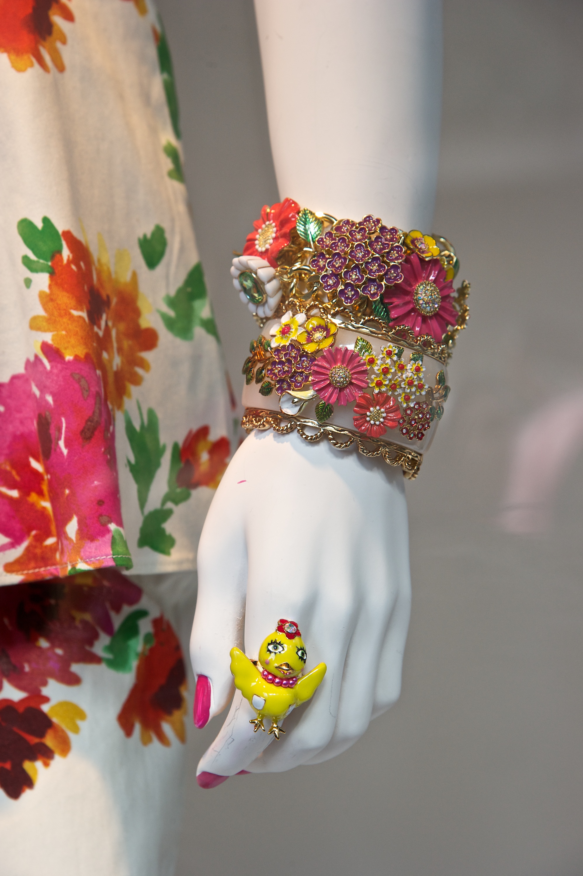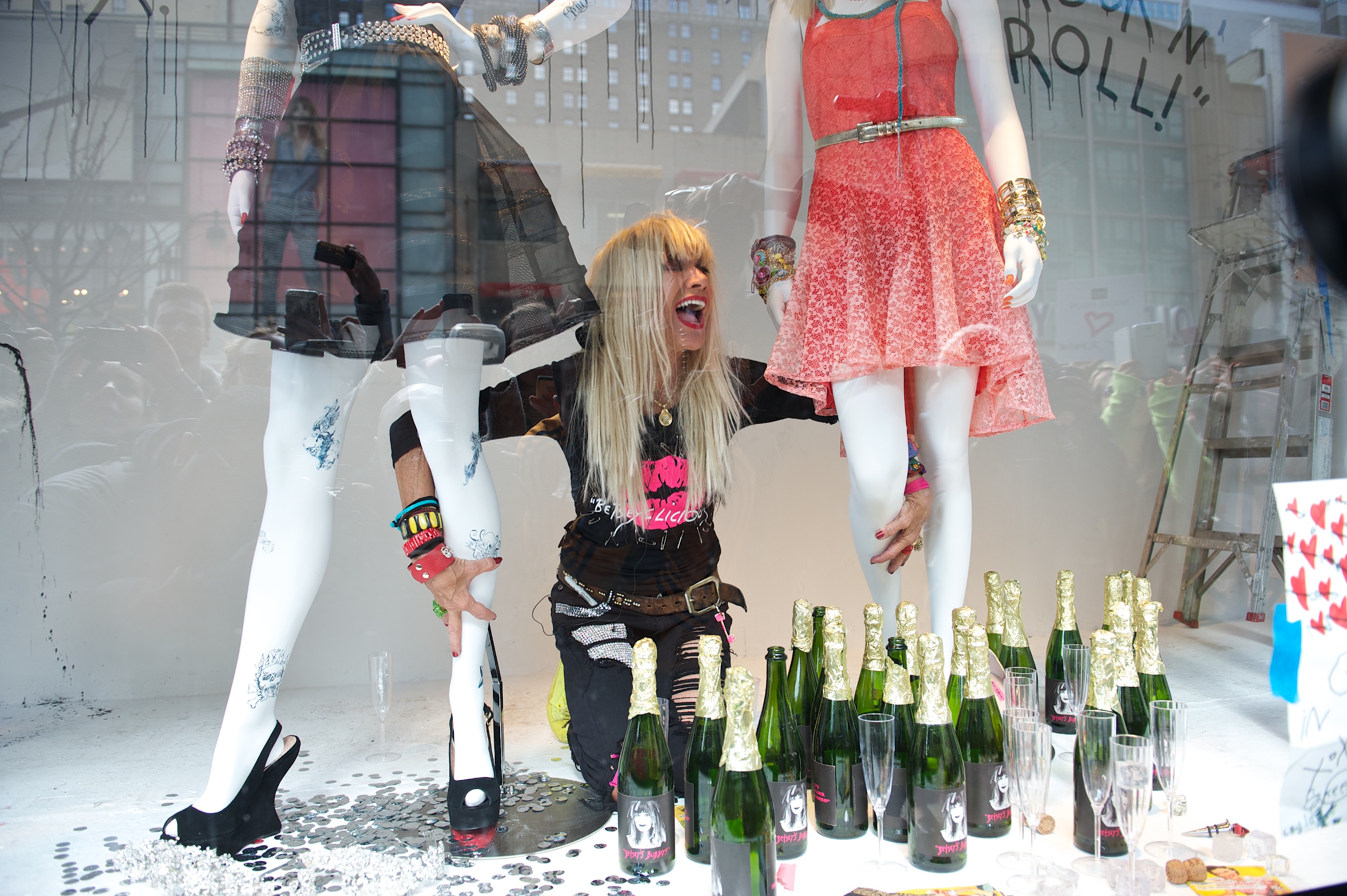 Betsey Johnson launched her new dress collection for Spring/Summer 2013 by making a personal appearance at Macy’s Herald Square on Wednesday afternoon. Fans and onlookers on 34th street viewed the trendy designer having fun styling mannequins in the window with a few looks from Spring/Summer that included flirty prints in eye-catching hues while keeping to true Betsey form of adding a little sweet and sexy rock n’roll, with sparkle, lipstick, and bottles of champagne. “I’m back! Doing my dress thing”, commented Johnson. The collection retails between $99 and $249.