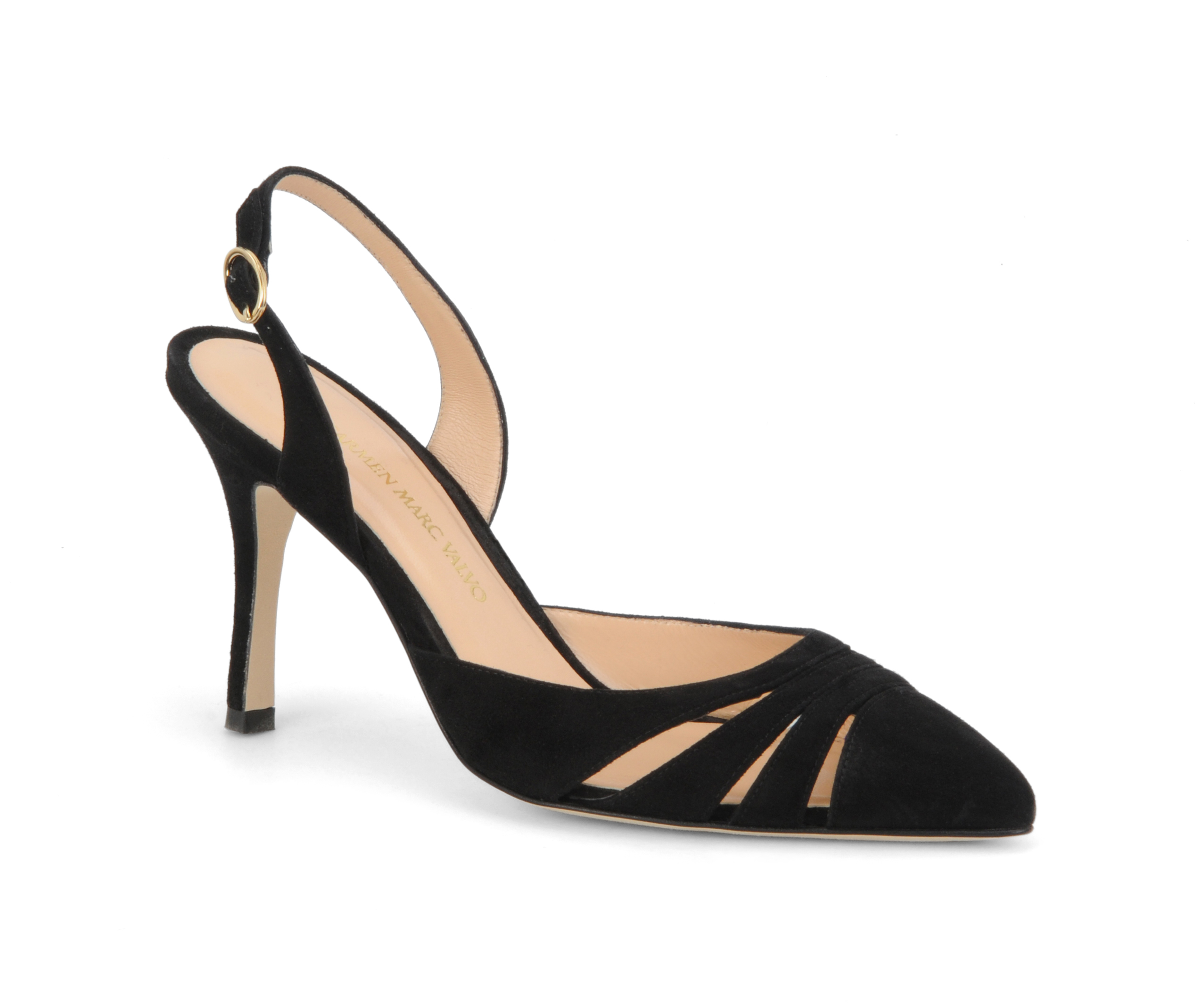 Carmen Marc Valvo, best known for his fur, eveningwear, swimwear and eyewear is at the moment debuting Carmen Marc Valvo Calzature footwear for fall 2013. The collection resumes the baroque and punk themes that were shown during fall runway. The footwear includes suede and leather featured in black and burgundy.