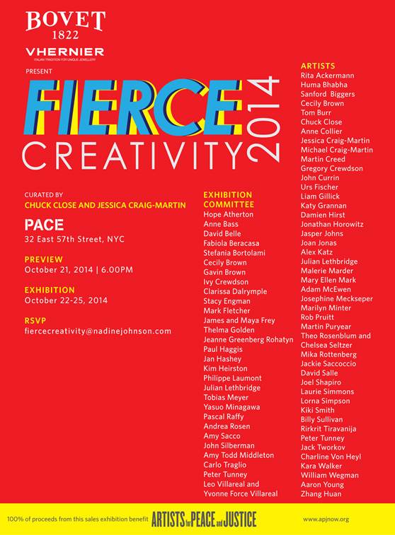 The second edition of Fierce Creativity benefitting Artists For Peace And Justice will assemble with a four-day selling exhibition at PACE Gallery located at 32 E 57th Street beginning October 21-25. PACE Gallery will feature work from over 45 leading contemporary artists including Chuck Close, Jessica Craig-Martin, Rita Ackermann, and Kara Walker. Curated by Chuck Close and Jessica Craig-Martin 100% of the proceeds from the exhibition will benefit Artists for Peace and Justice. “It would not have been possible for me to ask people to contribute if I did not believe in the effectiveness of Artists for Peace and Justice and in the new template it brings to the charity world, “ noted Jessica Craig-Martin. “These artworks are the fuel for a simple but powerful weapon: education. It is a cause that I believe all artists should be involved in, as there are none of us who could refute every child’s right to a good and free education.” Artists for Peace and Justice is a non-profit organization originated by filmmaker Paul Haggis. Through its effort to encourage peace and social justice around the world, APJ’s goal is to serve the poorest communities in Haiti with programs in education and healthcare through the arts, providing full scholarships to students. To learn more about Artists for Peace and Justice please visit www.apjnow.org