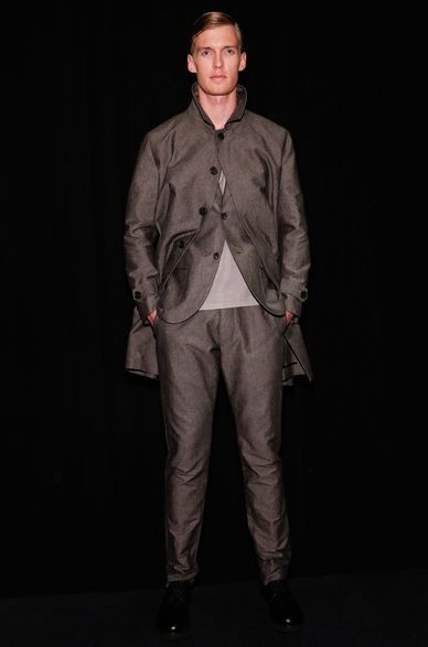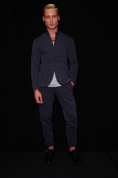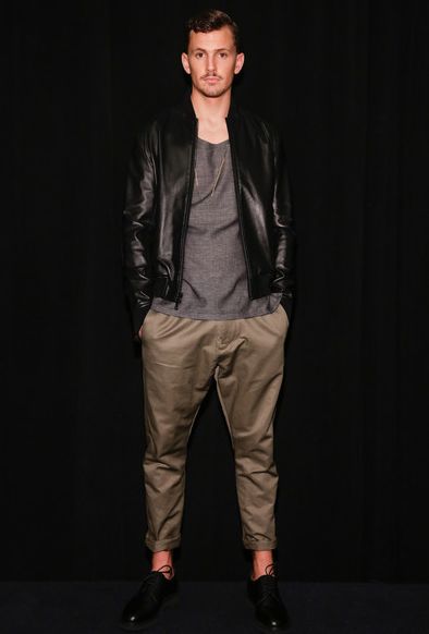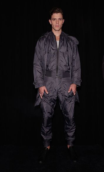 Brooklyn-based label Cadet presented the modern nomad for its Spring/Summer 2015 collection. Created for the globe-trotter that works from his laptop and smartphone while treating the world as his office the assortment highlighted versatile-travel –friendly pieces in a neutral color palette of grey, olive, stone and black. Cadet is cognizant of his customer and the advances of technology and travel and presented suit separates in relaxed wool blends and cotton jersey knits for overnight trips to straight to meetings without missing a beat. This was well-defined in a jersey blend blazer in deep blue styled with a waistband pant with elastic bottom in the same fabric and a mixed media tank top. Another highlight was a nylon flight parka and jacket combo in steel-blue paired with steel- blue nylon flight pants with full size zippers.