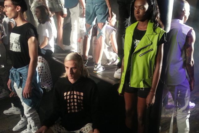 Third.nyc’s SS15 presentation was a scene reminiscent of a Brooklyn warehouse party complete with ambient electronic and trap music, an aggressive fog machine, dim lighting, and a gang of models clad in revealing streetwear. The urban brand’s vision of next summer involves showing skin and lots of it. Many of the pieces were accented with square cutouts, creating a more exaggerated mesh feel. The footwear of choice was a white high-top sneaker with sliver detailing. Key pieces included a green leather vest with moto detail, overall shorts with shoulder straps at both ends, and both graphic tees and sleeveless tees in white cotton and chambray. Despite the presence of both men’s and women’s looks, the overall feel of the collection was strongly masculine. The use of a vibrant lime green in many pieces called to mind the heyday of the 90’s New York club kids. The scene outdoors was just as visually stimulating with many street style photographers snapping candids of attendees on the Meatpacking district streets. Third.nyc’s vision of SS15 was strong in communicating that less is more, and it was certainly an aesthetic those in attendance clearly identified.