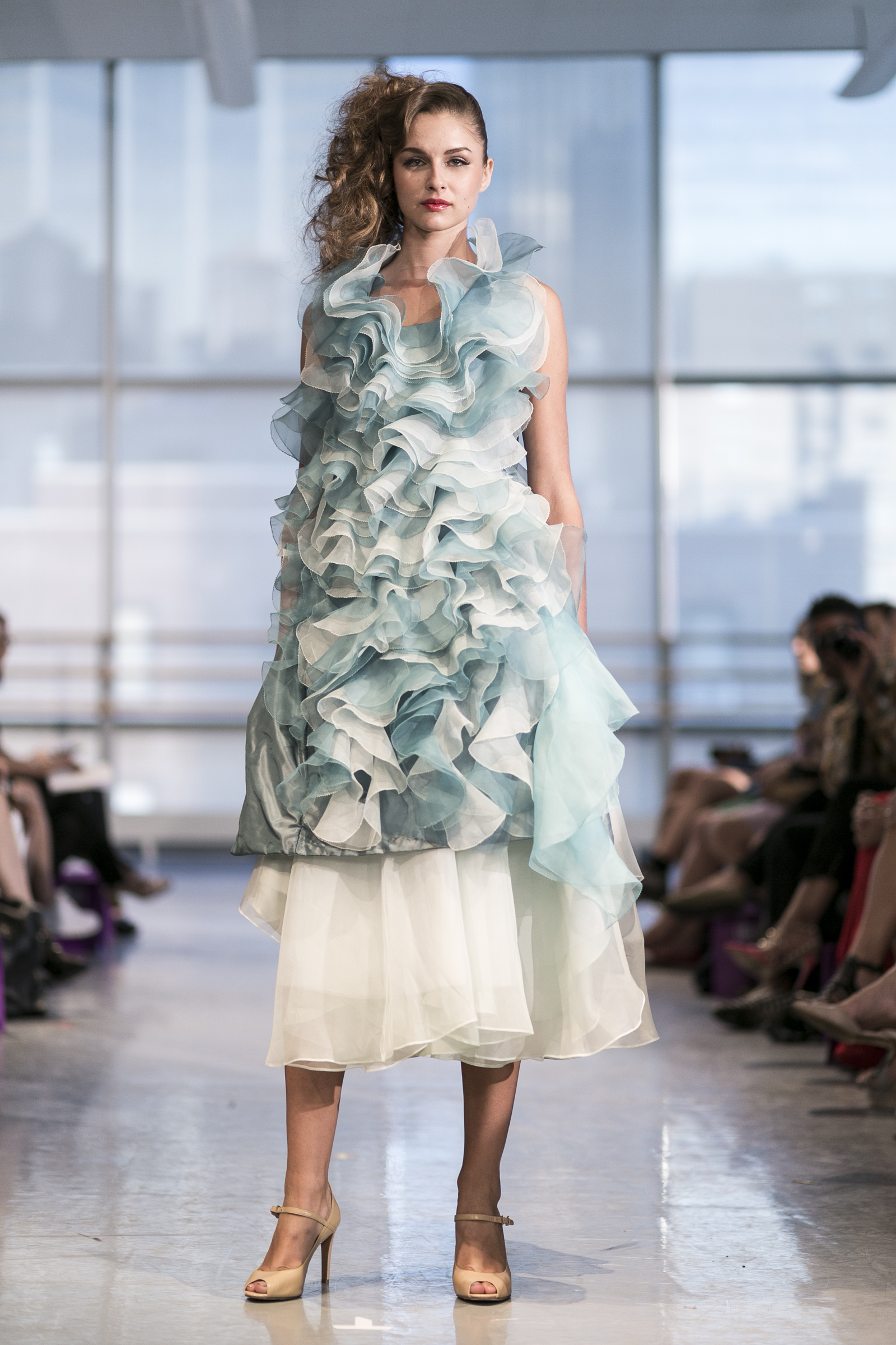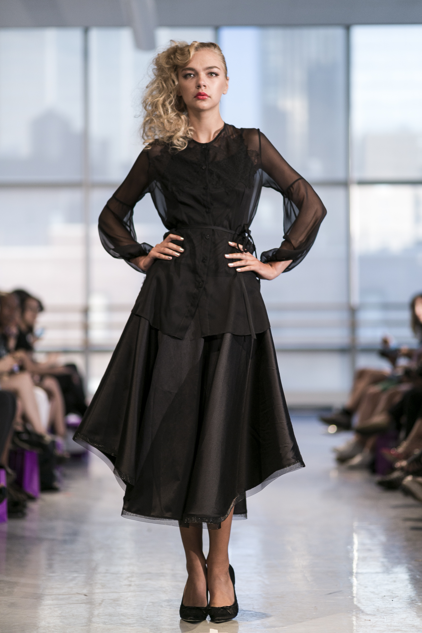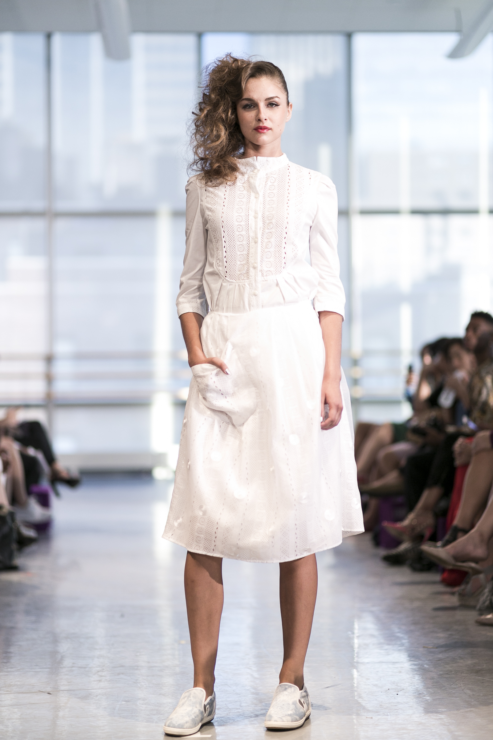 Ready to wear women’s brand Yuna Yang previewed a Spring/Summer 2015 that’s all about florals, loose silhouettes, and sheer overlay. Set to a 50’s big band soundtrack at the Alvin Ailey center, each look showcased a soft, feminine beauty that simultaneously favored comfort and style. Key standouts were the Four Layer Dress, Blue lace jacket with white pants, and White Polka Dot Coat with Black Dress. The Yuna Yang woman is one who wants to be seen: bold and unafraid to take a chance but definitely the best-dressed woman in the room.